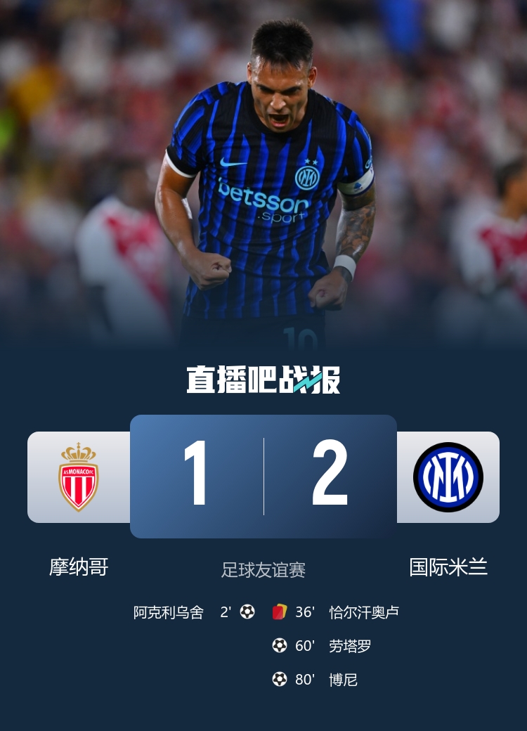 友谊赛对阵,十东谈主国米2-1逆转摩纳哥,恰20在第36分钟就染红,劳塔罗、博尼破门助球队取胜。