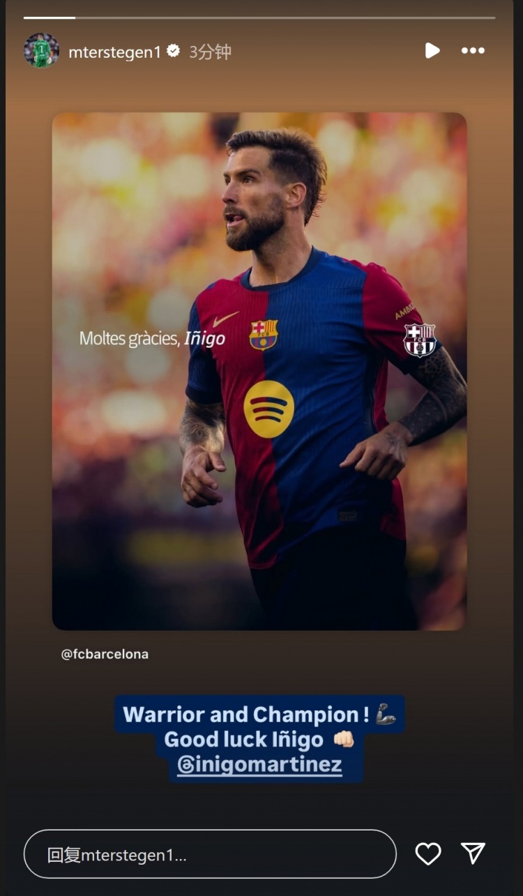 8月10日讯 巴萨中卫伊尼戈-马丁内斯解放身离队,加盟利雅得告捷,巴萨门将特尔施特根更新社媒动态,与伊尼戈告别。