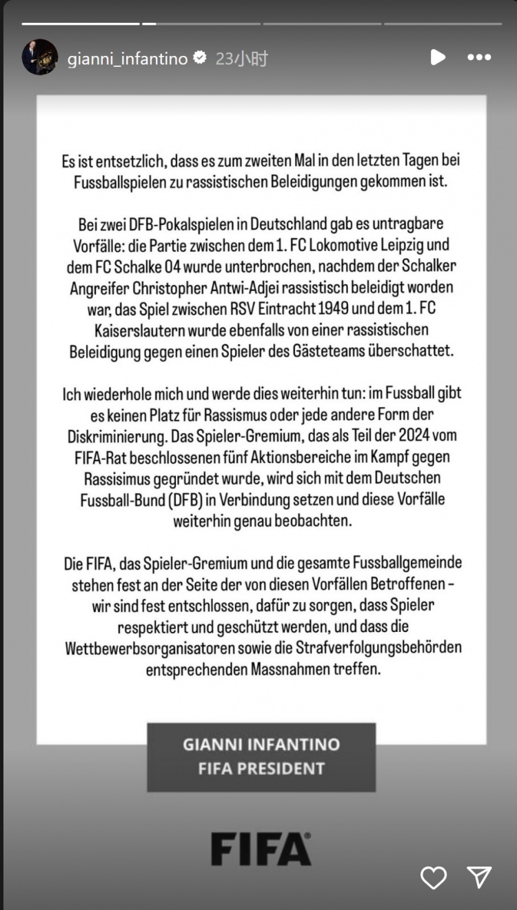 8月19日讯凯 海外足联主席因凡蒂诺更新社媒动态,对德国杯种族憎恨事件发声。