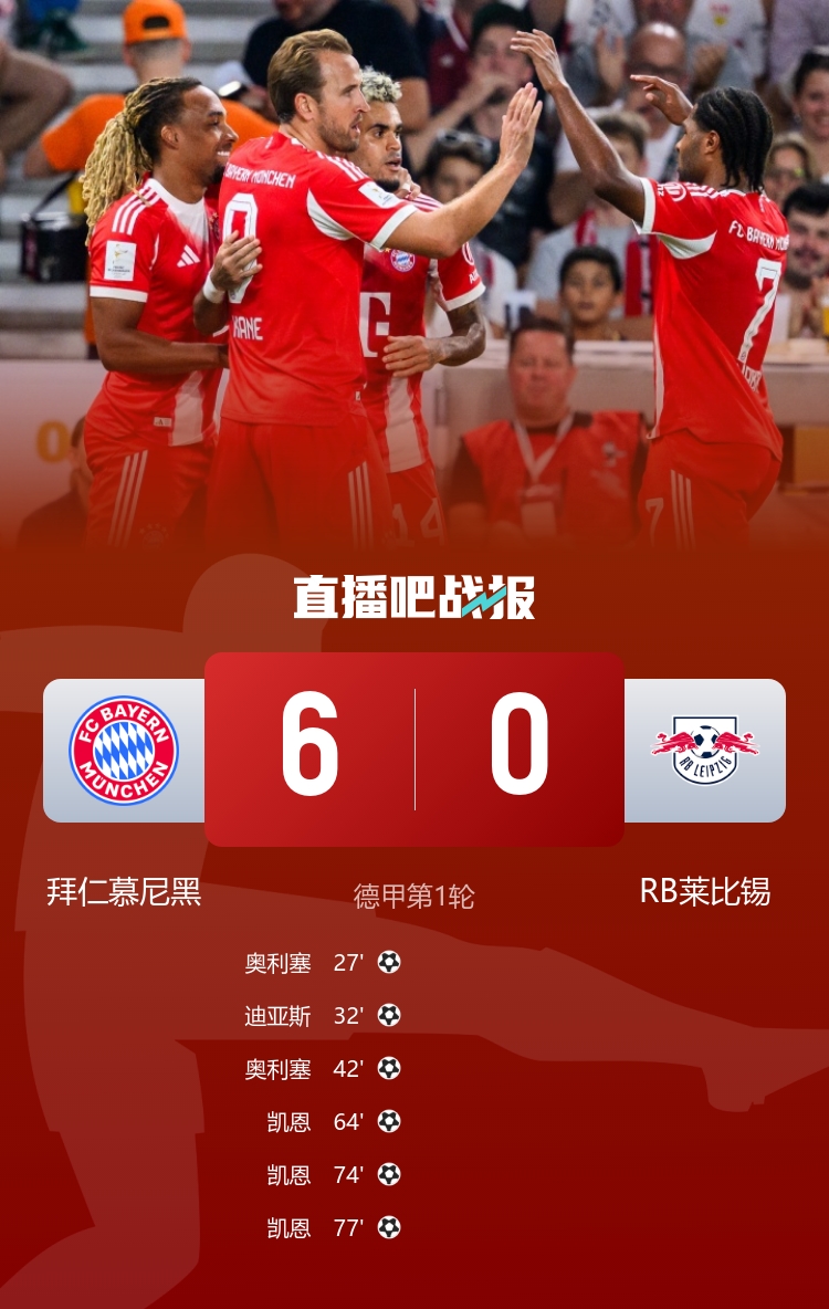 德甲首轮,拜仁6-0横扫莱比锡拿下开门红,凯恩首轮就戴帽,新援迪亚斯1球2助阐述出色,奥利塞斩获两球。