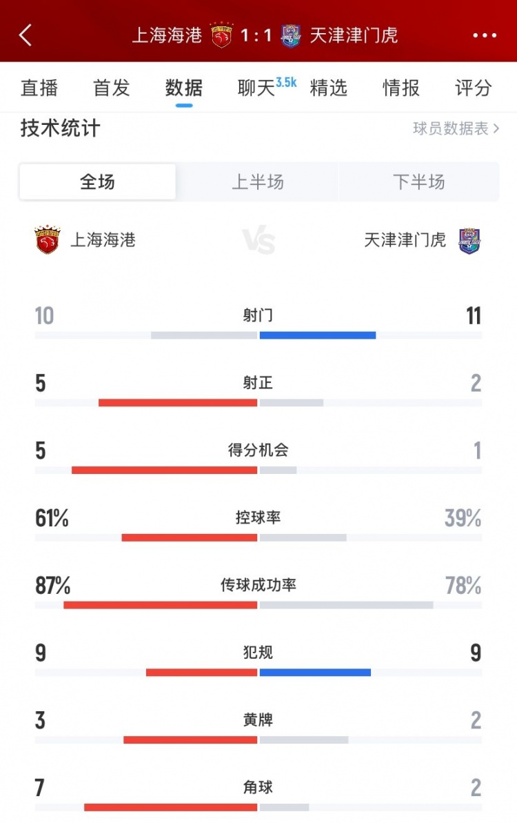 8月24日讯 中超联赛第22轮,上海海港1-1天津津门虎,三连胜阻隔,距榜首1分。以下为两边全场数据对比