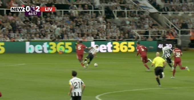 这一画面发生于第47分钟,那时利物浦多打一东说念主2-0卓绝。纽卡反击,巴恩斯前插,科纳特补防,前者倒地,裁判未吹罚,VAR未介入,吉马良斯抗议判罚因此吃到黄牌。