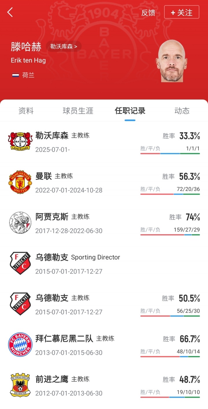 滕哈赫现年55岁,荷兰籍栽种。曾先后合手教前进之鹰、拜仁二队、乌得勒支、阿贾克斯、曼联以及勒沃库森。