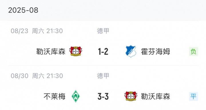 滕哈赫本赛季设备勒沃库森德甲开赛两轮不堪,只拿到1分。