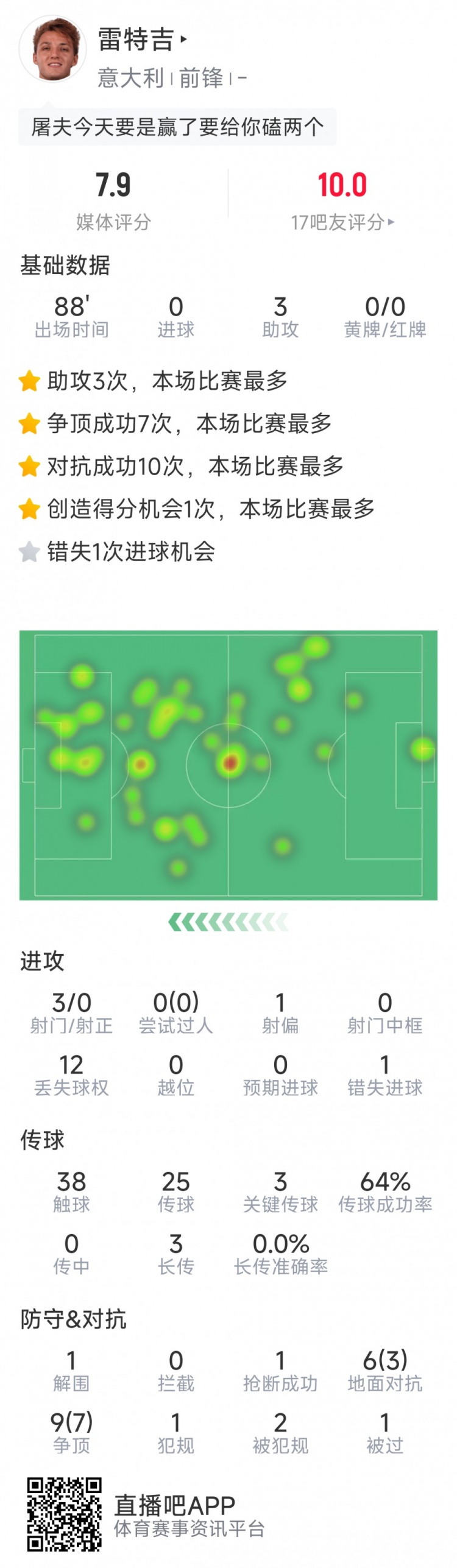 9月9日讯 在本轮世初赛,意大利5-4打败以色列,雷特吉助攻帽子戏法,以下为他在本场数据: