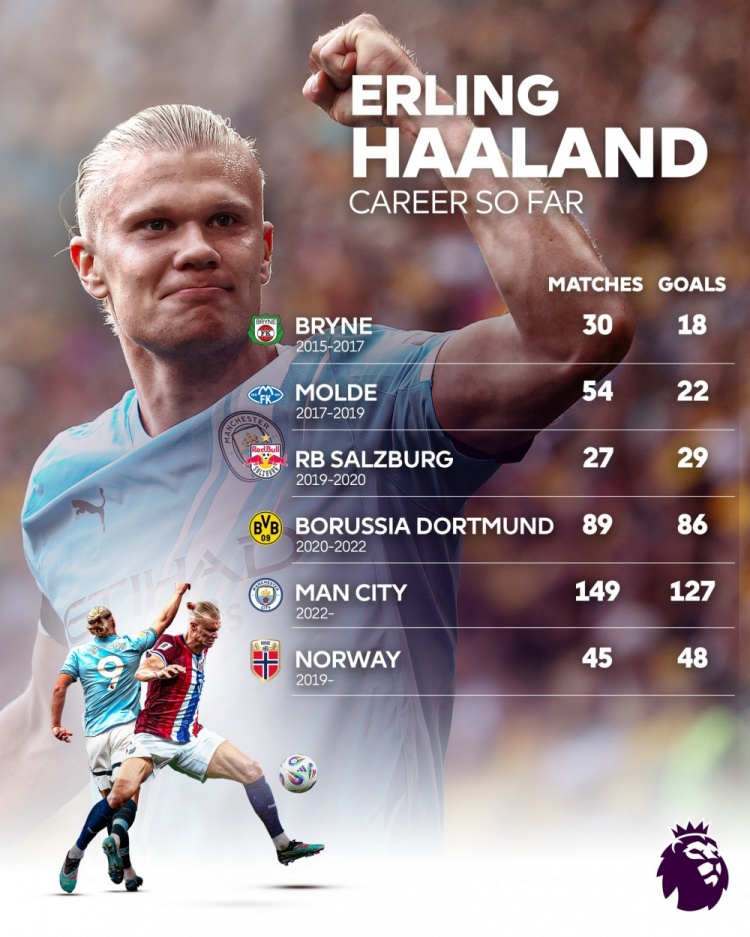 9月11日讯 英超官方统计了哈兰德行状糊口于今进球的散播,并晒出数据图片,哈兰德在曼城149场127球,在挪威队45场48球。