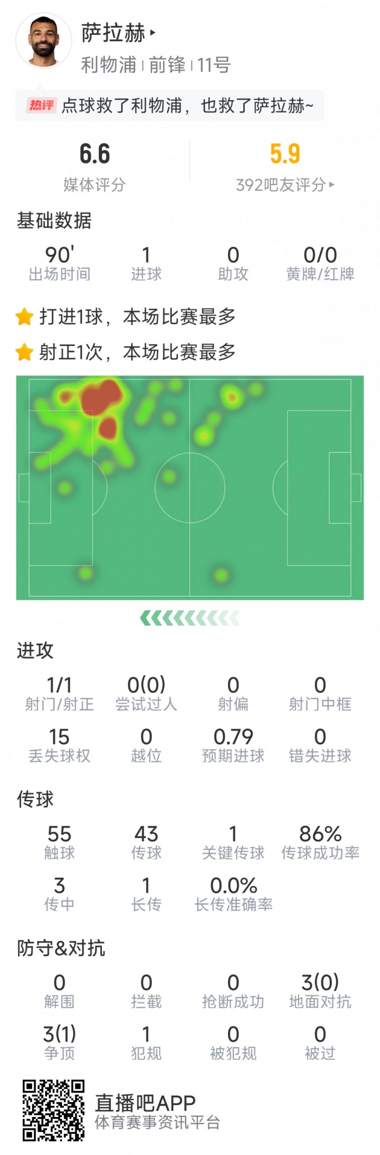 9月14日讯 在本轮英超,利物浦1-0险胜伯恩利。萨拉赫打进点球完成绝杀,以下为他在本场数据: