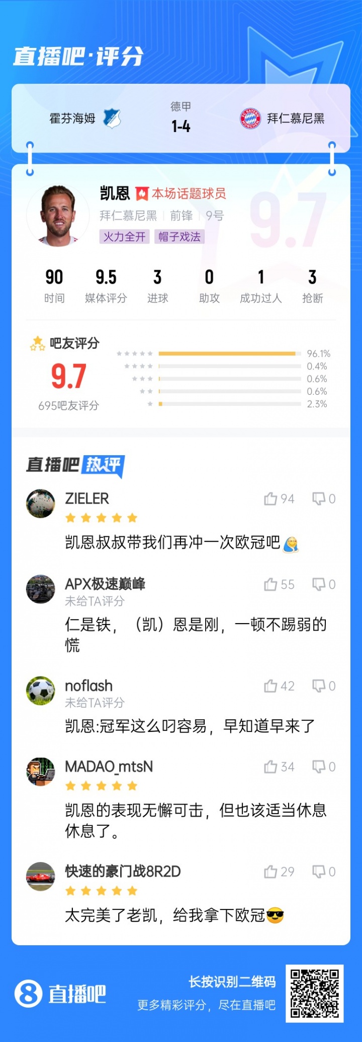第四轮评比成果结出炉,凯恩献艺帽子戏法,匡助拜仁4-1打败霍芬海姆,取得吧友近7万票扶助,当选【X小红书德甲第4轮最好球员】!