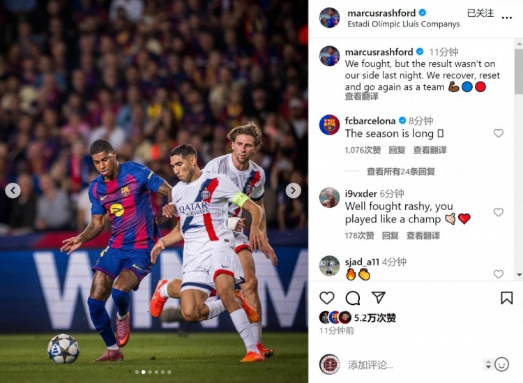 拉什福德社媒晒出比赛像片,并写说念:“咱们起劲构兵,但昨晚的比赛遵循不如咱们所愿。”