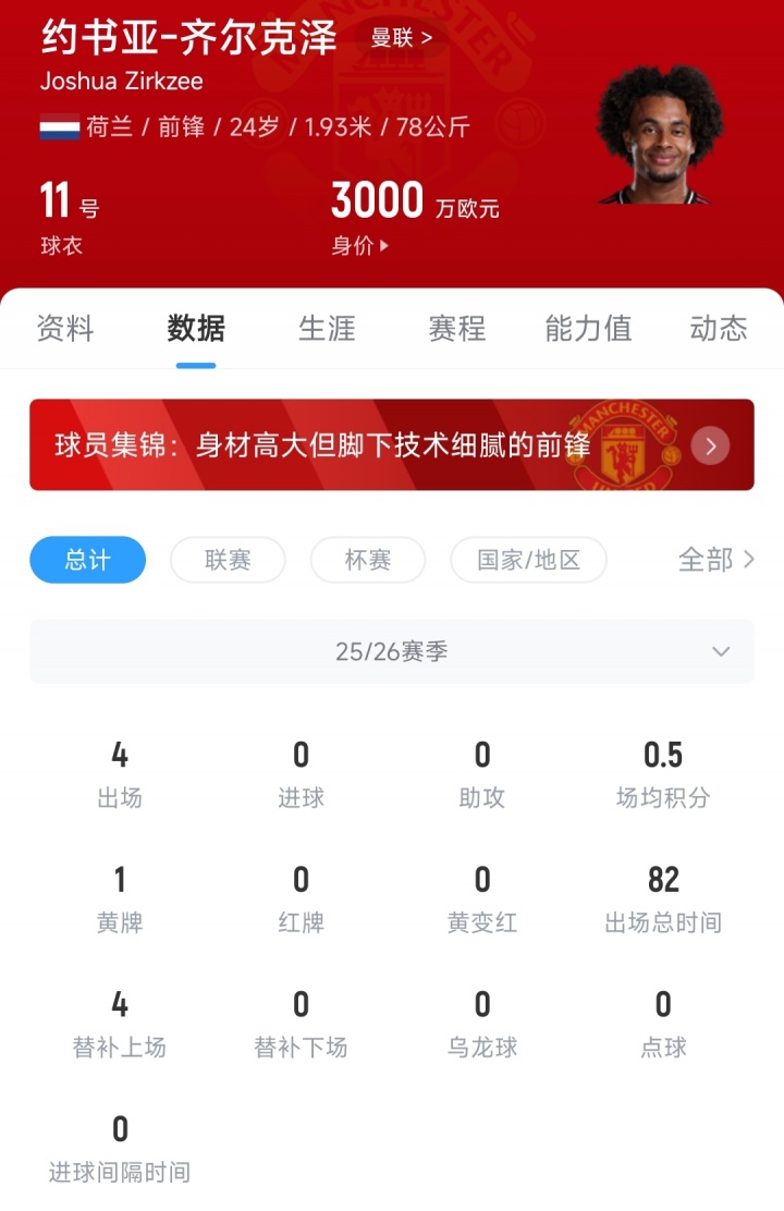 2024年夏窗,时任曼联主帅滕哈赫浪掷4250万欧元,从博洛尼亚签下了我方的荷兰老乡皆尔克泽。加盟曼联于今,皆尔克泽共代表球队出战53场比赛,孝敬7粒进球和3次助攻,现在24岁的皆尔克泽德回身价为3000万欧元。