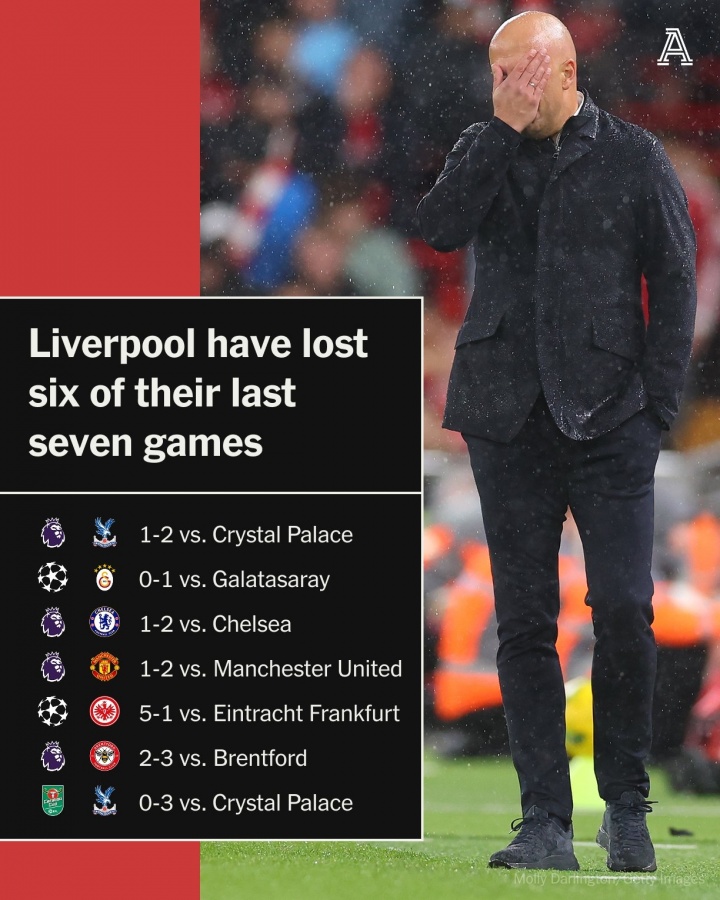 利物浦各项赛事近7场6败,联赛杯出局、停步16强,英超过时榜首7分。上赛季的耐考王如今节节退败。