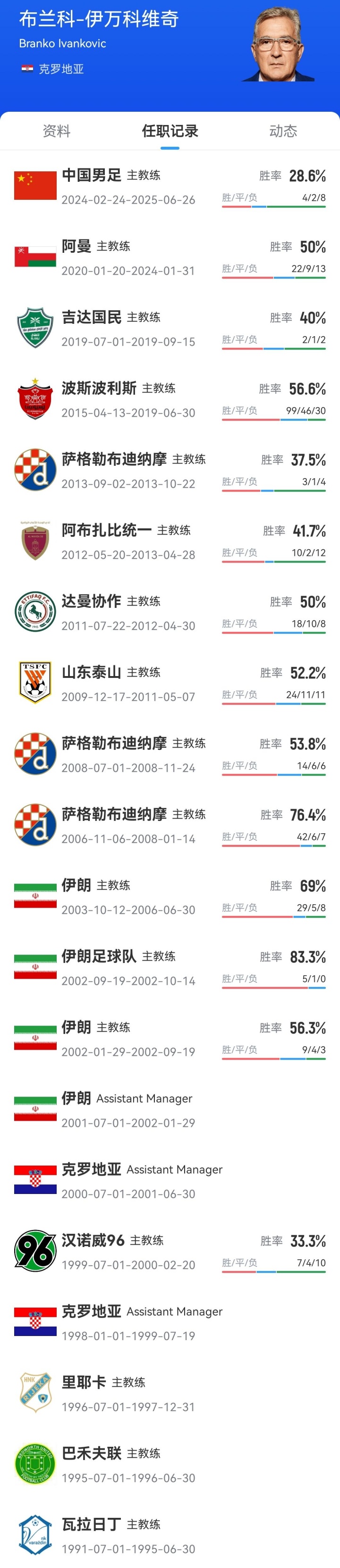 2024年2月24日,伊万出任中国男足主帅,2025年6月27日下课,本领共带队认真比赛14场,战绩为4胜2平8负。其中叶初赛36强赛国足1胜2平1负“躺进”18强赛,18强赛国足3胜7负进7球丢20球,提前1轮无缘2026好意思加墨寰宇杯。国足也成为伊万握教生存的临了一站。