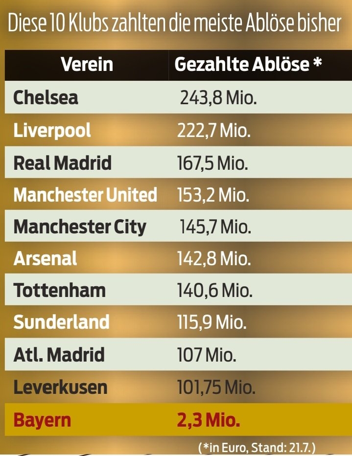 7月23日讯 闻明拜仁自媒体号Bayern & Germany转载了一则今夏足坛在支拨上排在前哨的俱乐部盘货,拜仁被列在了最底下行为对比。