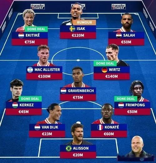 前场三叉戟将由萨拉赫(5000万欧)、埃基蒂克(7500万欧)和可能加盟的伊萨克(1.2亿欧)组成,三东谈主身价总共达2.45亿欧元。