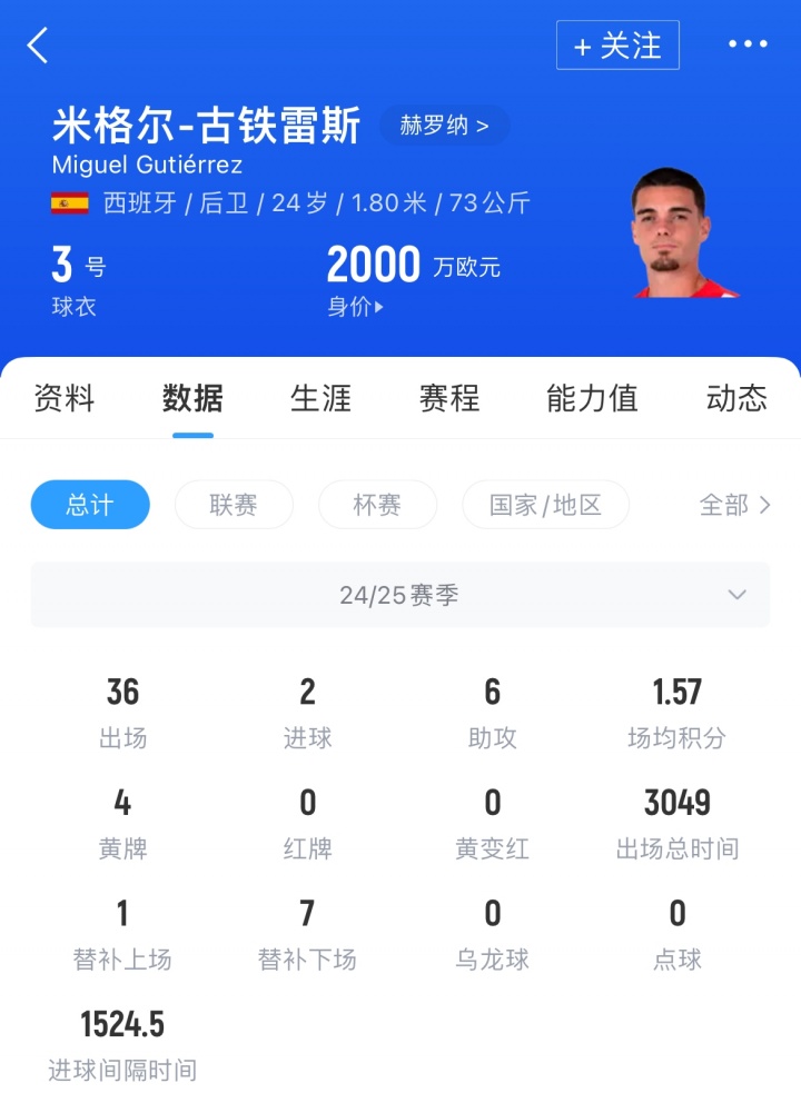 上赛季,古铁雷斯为赫罗纳出战36场,获得了2粒进球和6次助攻,现在其德回身价为2000万欧。