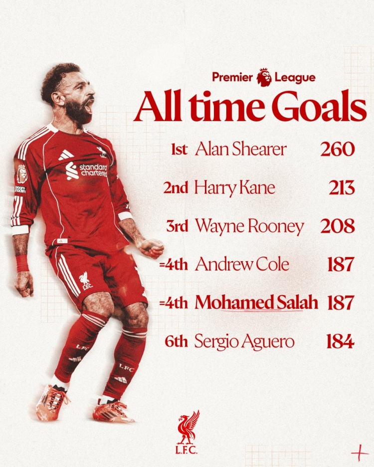 利物浦官方社媒晒出英超历史弓手榜,此役事后萨拉赫的英超进球数达到187个,追吉祥迪-科尔比肩第四。