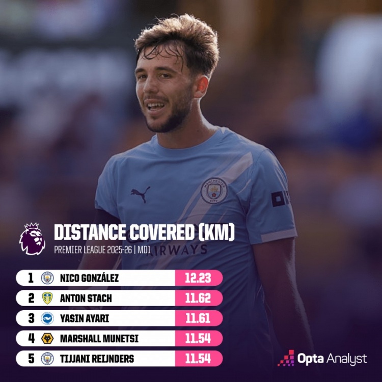 8月21日讯 Opta统计球员在英超首轮比赛中的跑动距离,并排出榜单,尼科-冈萨雷斯12.23公里居首。