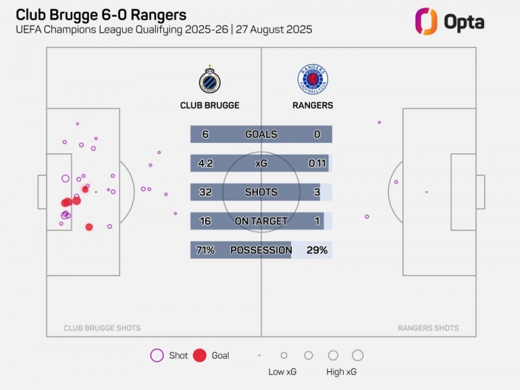 据OptaJohan的数据统计,布鲁日6-0大捷流浪者,这是他们自2001年9月27日(7-1尼科西亚奥林匹亚科斯)以来在欧战中最大比分的到手。