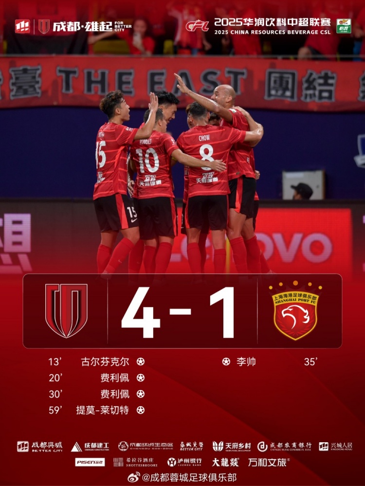 易边再战,59分钟,罗慕洛主罚角球,提莫头球破门,比分扩大为4-1!3分钟后杨帅打入一球,因越位被判无效。79分钟时,小将徐虹替补上场,迎来个东说念主中超首秀!本场比赛中刘殿座屡次飞身扑救。最终,成齐蓉城以4-1征服上海海港!