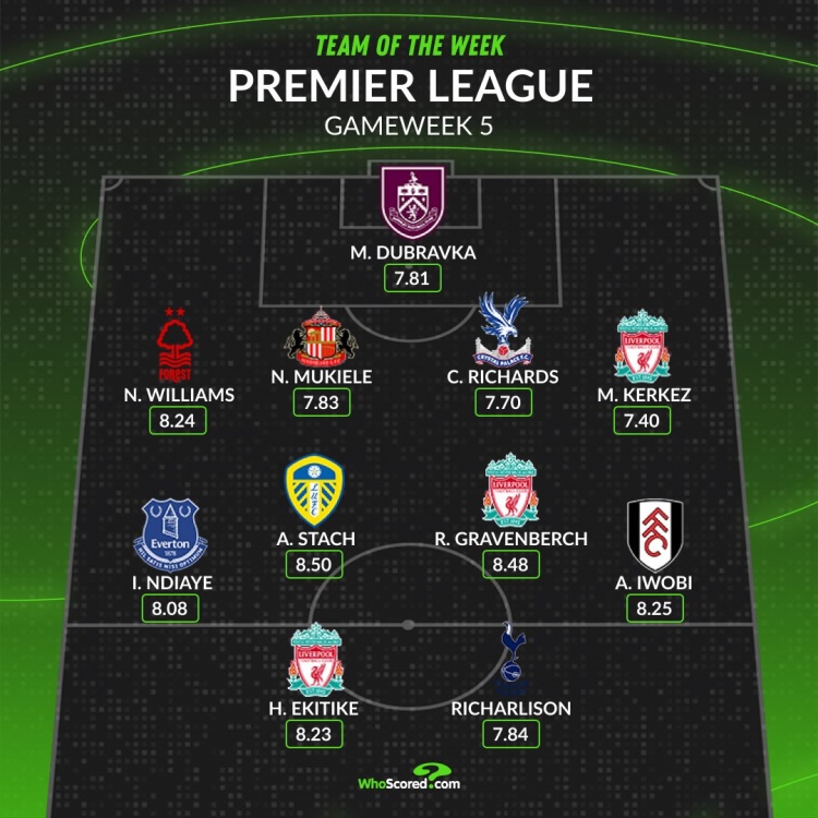 9月22日讯 WhoScored评出了英超第5轮比赛最好威望,理查利森、埃基蒂克在列,利物浦3名球员入选。