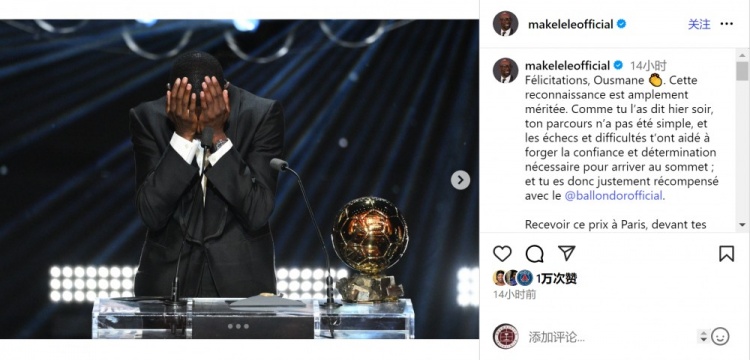 马克莱莱晒出登贝莱领奖的像片,配文:“祝愿你,奥斯曼👏。这份荣誉实至名归。正如你昨晚所说,你的成长之路并抵御坦,艰难与挑战铸就了你登顶所需的自信与决心,因此金球奖的奖杯恰是你应得的答复。在巴黎,在你的队友、一又友和家东谈主的见证下取得这个奖项,让这个时分变得愈加相当。