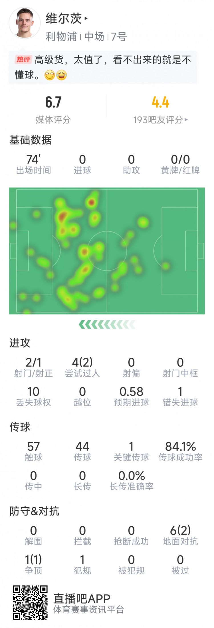 维尔茨加盟利物浦也曾踢了7场阐扬比赛(社区盾不算),于今仍0球0助。而本场比赛他也简直毫无孝敬,场上的要津镜头也绝顶少。
