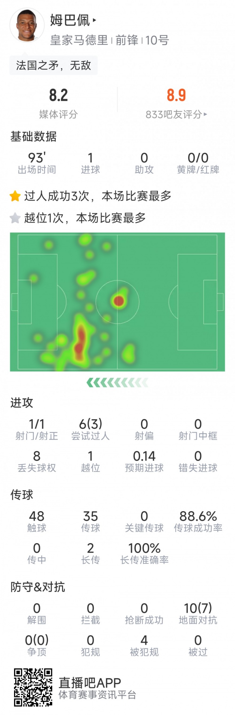 9月28日讯 在本轮西甲马德里德比,马竞5-2打败皇马。本场比赛姆巴佩破门,以下为他在本场数据: