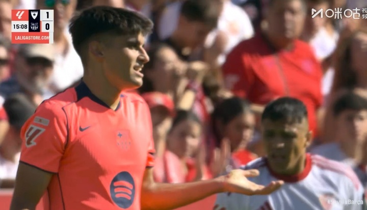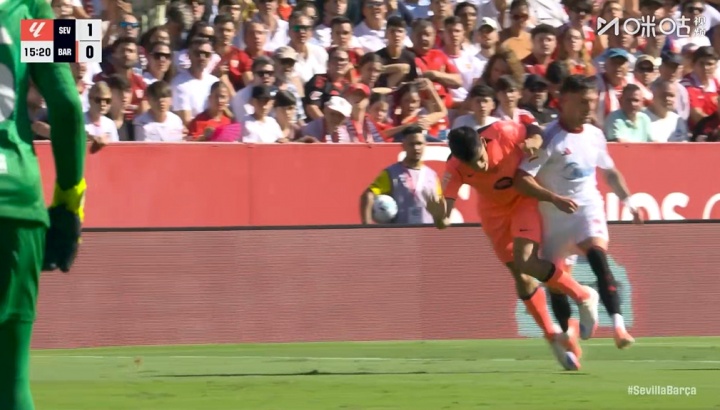 10月05日讯 塞维vs巴萨第16分钟,巴萨左后卫马丁左路戒备中放倒敌手,吃到一张黄牌。