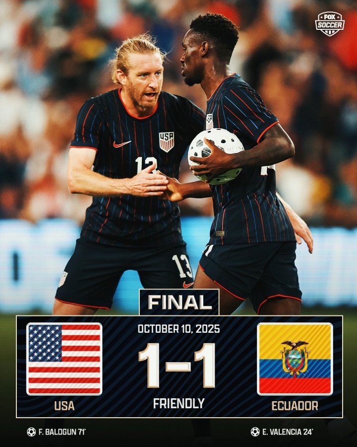 10月11日讯 足球友谊赛,好意思国1-1战平厄瓜多尔。本场比赛恩纳-瓦伦西亚最初破门,巴洛贡为好意思国队扳平比分,攻破“南好意思之墙”的大门。