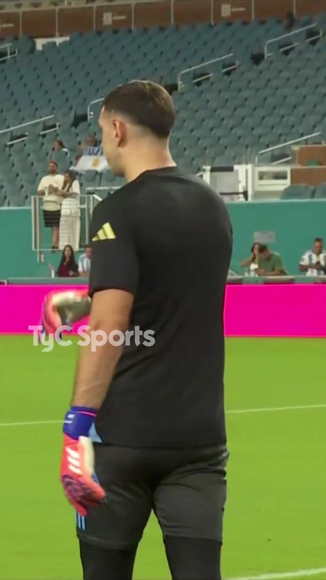 阿根廷队今天在迈阿密与委内瑞拉队热身,赛前,阿根廷队门将大马丁看到了一位身穿他的家乡球队阿尔多西维球衣的球迷,并商定施舍磨练服。随后,大马丁让责任主说念主员将我方的磨练服施舍给这位球迷。