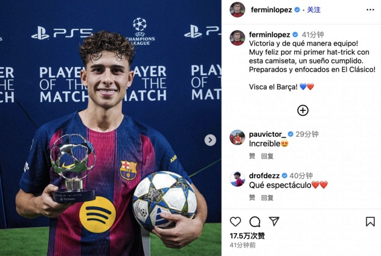 一场成功,球队踢球的形状太棒了!我终点欢快献艺了身披这件球衣的首个帽子戏法,梦思成真,当今要准备国度德比了!加油巴萨!