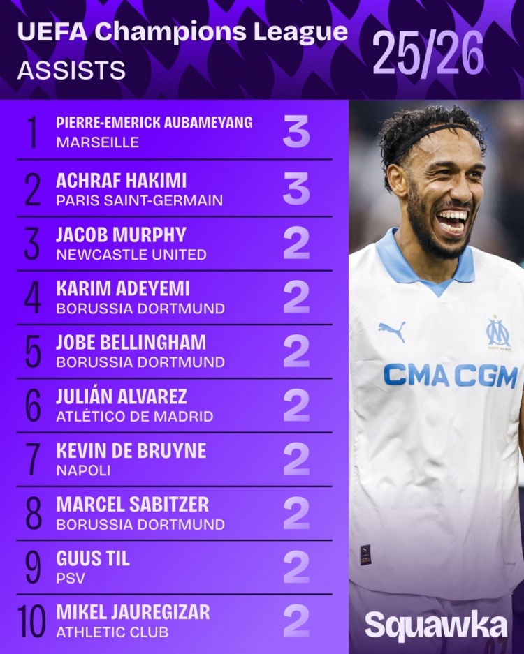 10月23日讯 本赛季欧冠联赛阶段已战罢3轮,Squawka统计了到现在步伐的助攻榜,马赛时尚奥巴梅扬和巴黎后卫阿什拉夫均是3次助攻,分列前二。