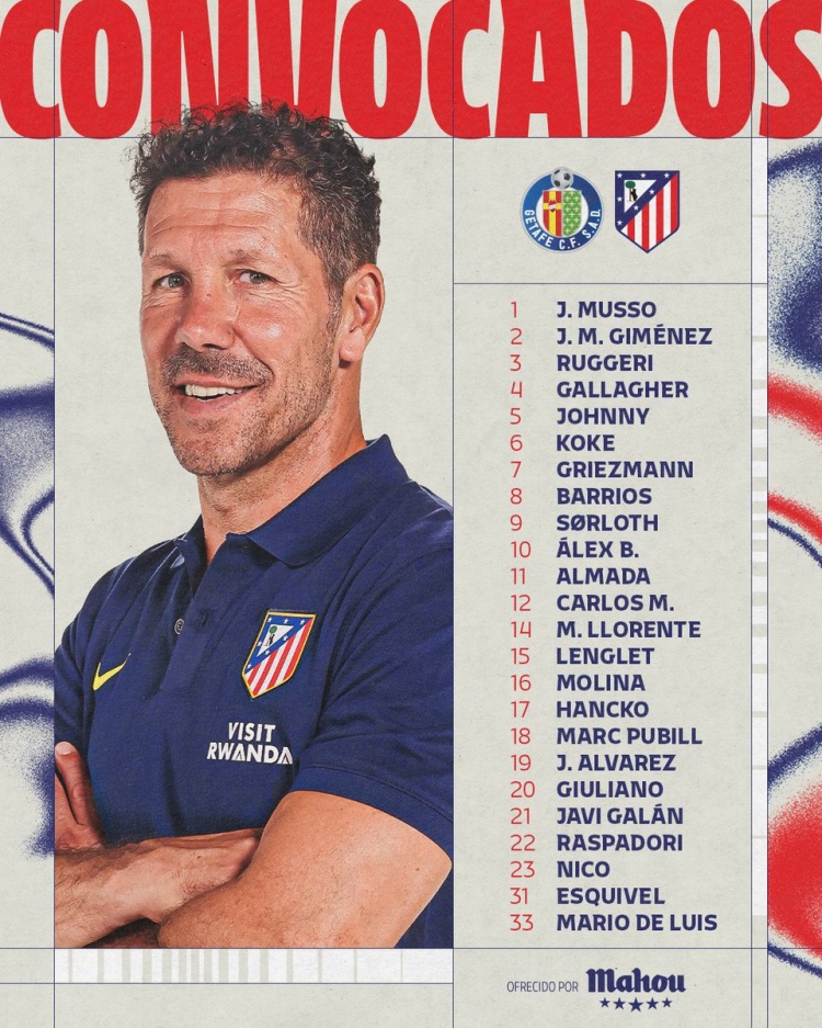 时尚:7-格列兹曼、9-瑟尔洛特、10-巴埃纳、11-阿尔马达、12-卡洛斯·马丁、19-阿尔瓦雷斯、20-朱利亚诺·西蒙尼、22-拉斯帕多里、23-尼古拉斯·冈萨雷斯
